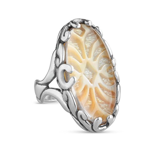 -. Binding : Jewelry -. Brand : Relios Jewelry -. Department : womens -. Feature : Genuine Yellow Mother of Pearl, Crystal Quartz, and .925 Sterling Silver / Measures approximately 1-1/8" long x 3/4" wide / See Ruler View for accurate sizing. Silver may tarnish over time. / Handcrafted in America with lifetime warranty on all jewelry / Sterling silver encases a carved yellow mother of pearl and rock crystal quartz doublet. -. Label : Relios -. Manufacturer : Relios -. ProductGroup : Jewelry -. ProductTypeName : FASHIONRING -. Publisher : Relios -. Studio : Relios -. Title : Relios Sterling Silver Yellow Mother of Pearl Crystal Quartz Ring