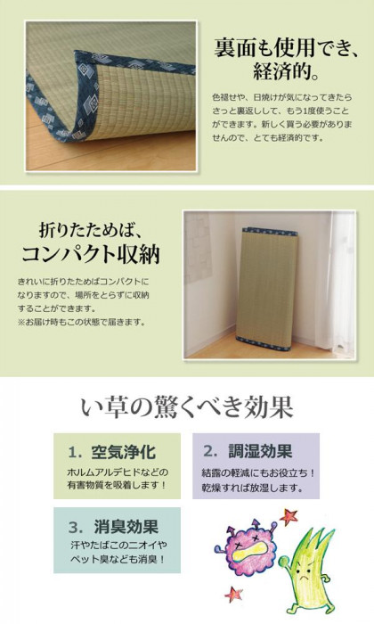 上敷きを敷くだけで畳のお部屋をリフレッシュ出来ます。日焼けしてしまった畳のリフレッシュに、新品の畳を汚さないためのカバーにご使用下さい。