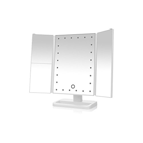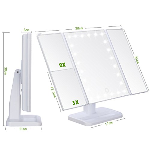 LenFeco Led Lighted Vanity Mirror Make Up Tri-Fold with 24Pcs Lights 180 Degree Free Rotation Table Countertop Cosmetic Bathroom Mirror Touch Screen 1x/2x/3x Magnification and Usb Charging (White)