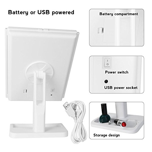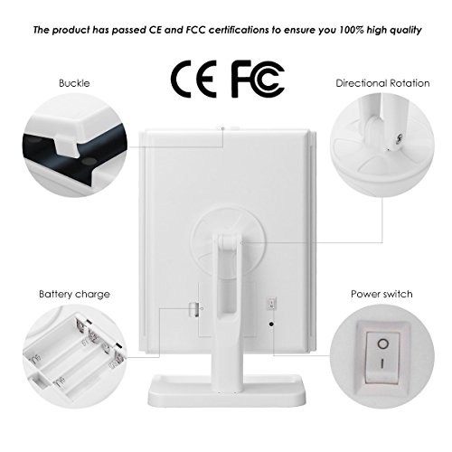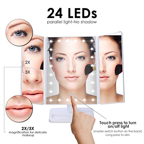24 PIECES LED LIGHT: Our makeup mirror is built-in 24 pieces adjustable Led lighted brightness,allow you makeup in the dark or poorly lit areas.LED lights on/off controlled by the touch sensor switch.