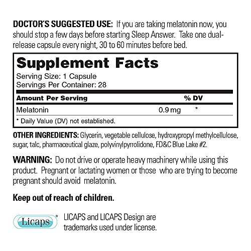 FALL ASLEEP FASTER UP TO 20 MINUTES QUICKER. Unlike ordinary melatonin supplements, Sleep Answer's cutting-edge "capsule-in-capsule" technology delivers 2 optimal doses of melatonin at the right time. The outer capsule releases the first 0.3 mg dose of melatonin when you're ready for bed. Then, 3 to 4 hours later its inner capsule releases a 0.6 dose of melatonin as extra insurance that you'll sleep restfully through the night. Studies of melatonin at the ideal mg dose found it: