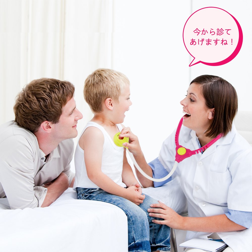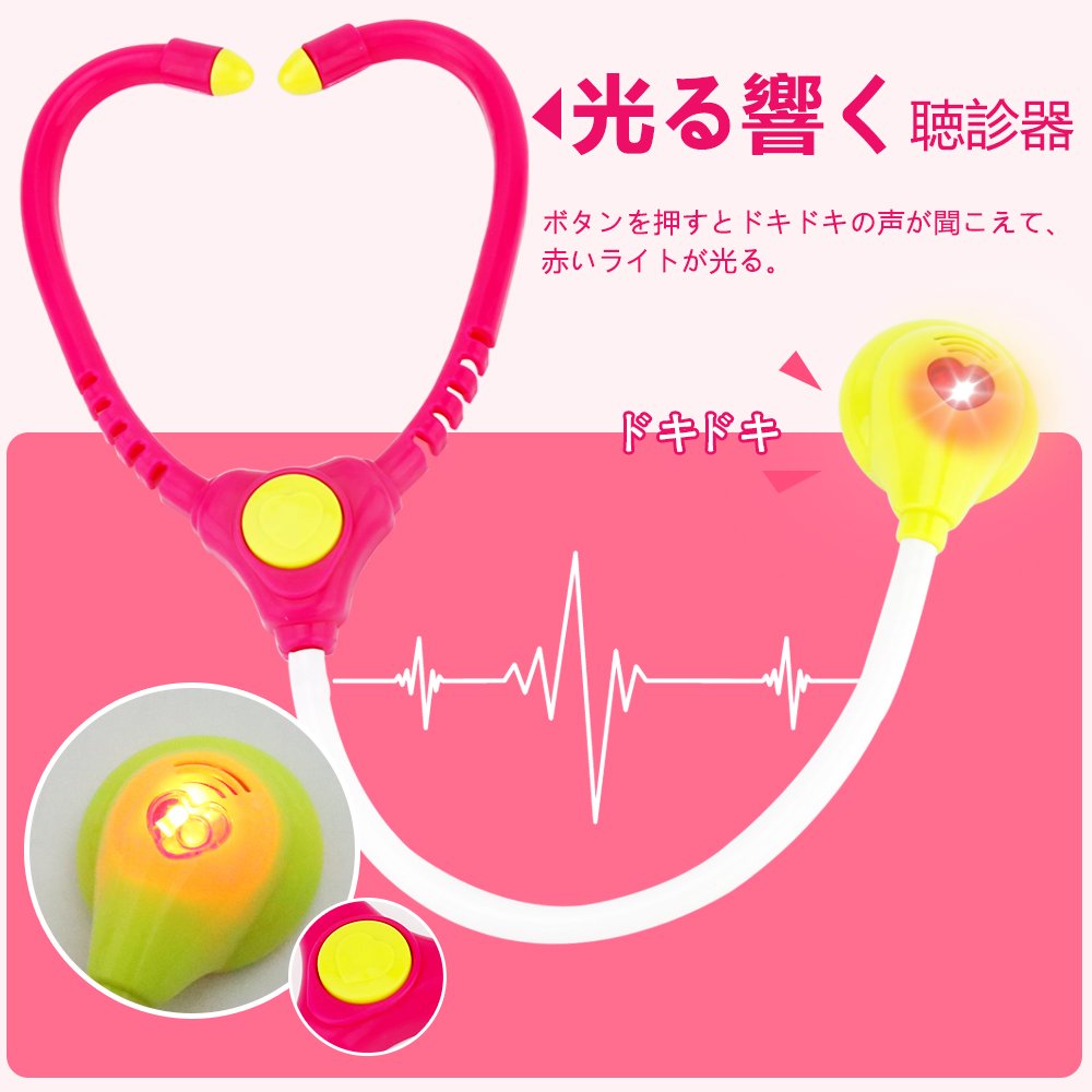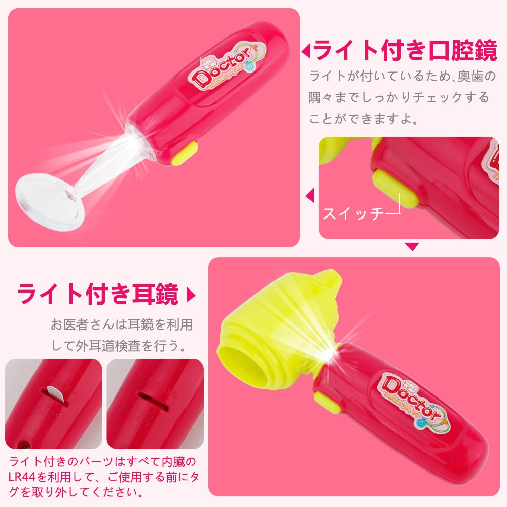 光る響く道具:ドキドキの心臓音が聞こえ、赤いライトが光る聴診器;奥歯をしっかりチェックできるライト付き口腔鏡。病院嫌い、薬が飲めないなどのお子様にも、お医者さんごっこおもちゃはおすすめです。