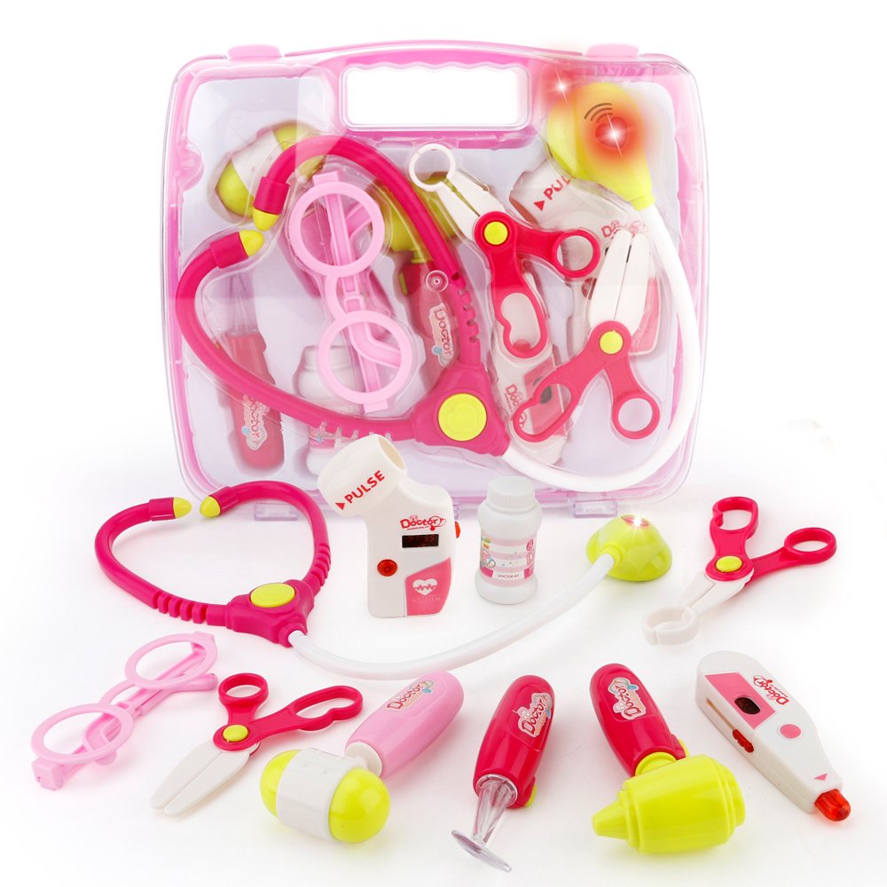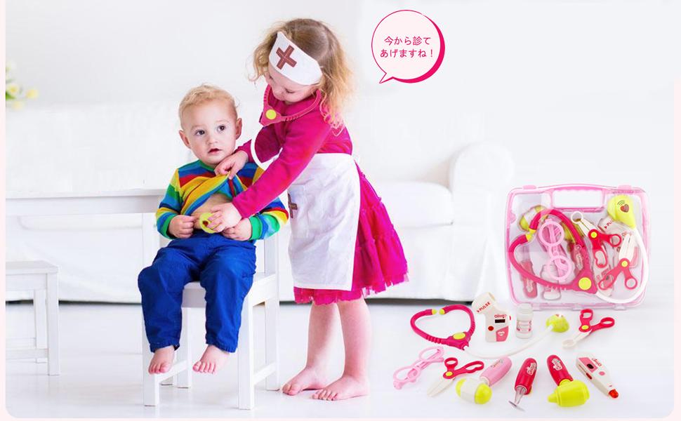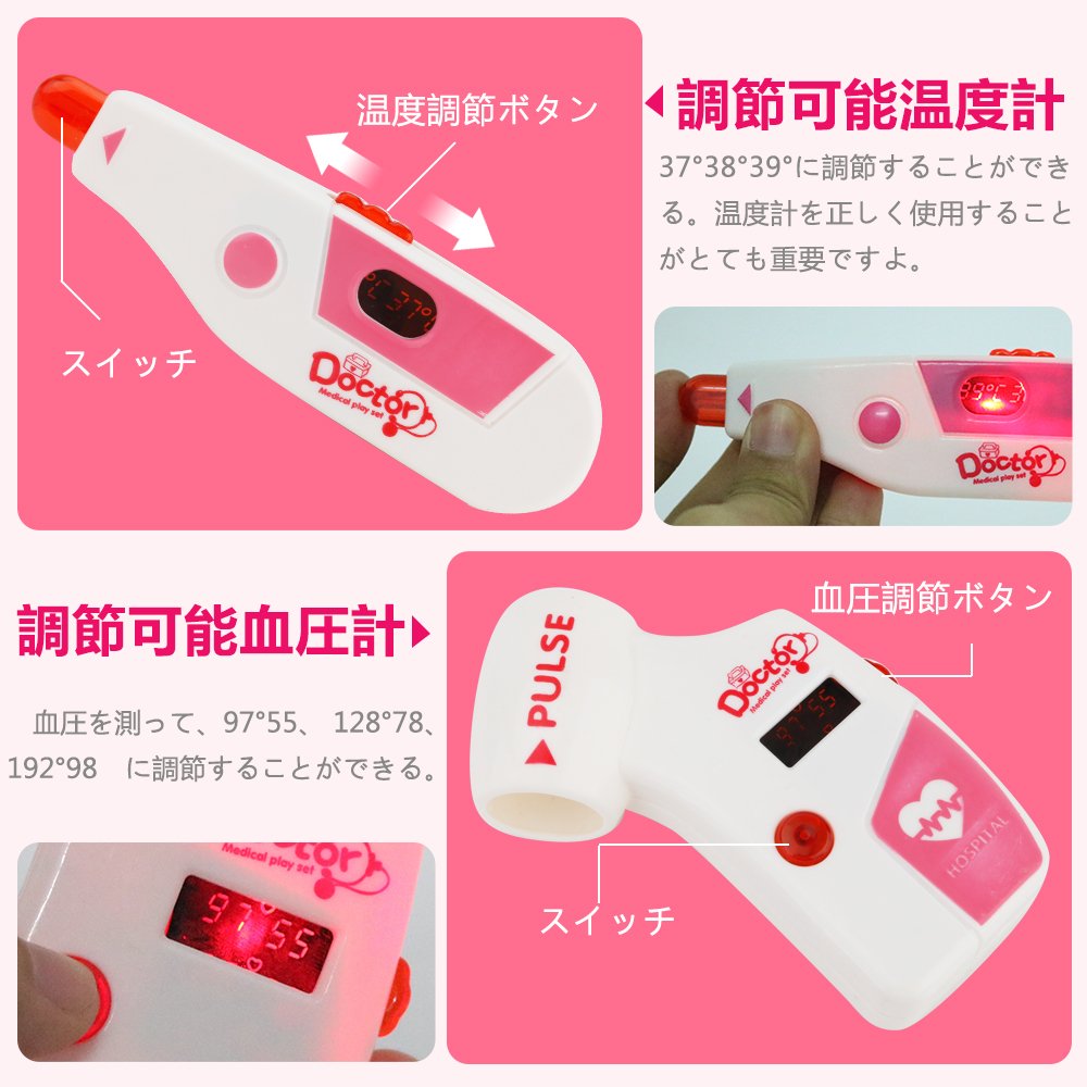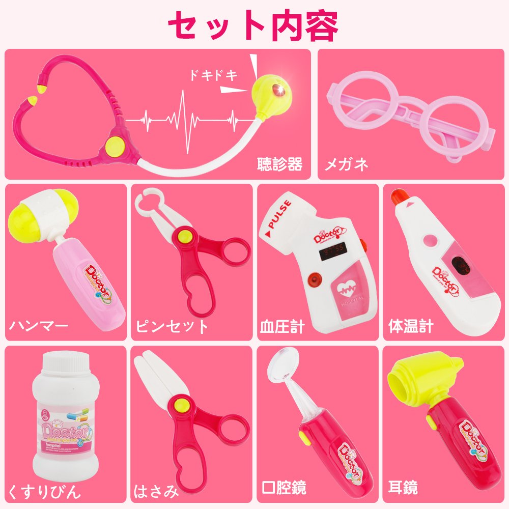 光る響く道具:ドキドキの心臓音が聞こえ、赤いライトが光る聴診器;奥歯をしっかりチェックできるライト付き口腔鏡。病院嫌い、薬が飲めないなどのお子様にも、お医者さんごっこおもちゃはおすすめです。
