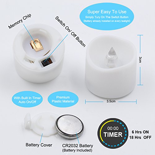- ★ NEW TIMER FEATURE BRIGHT YELLOW TEA LIGHTS EXCLUSIVELY - This feature makes on/off flameless candles flickering tealights even simpler. The lights will be lit for 6 hours and then they will automatically turn off for 18 hours and keep repeating this process . With this feature users can just turn the LED tea lights on and leave them at a desired location such as birthday wedding party seasonal & festival celebration