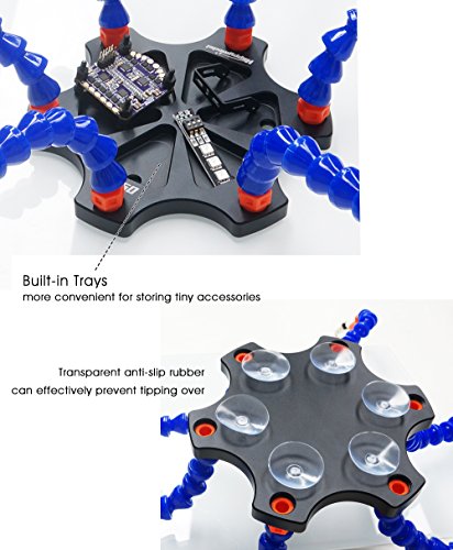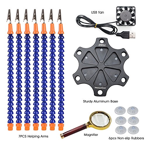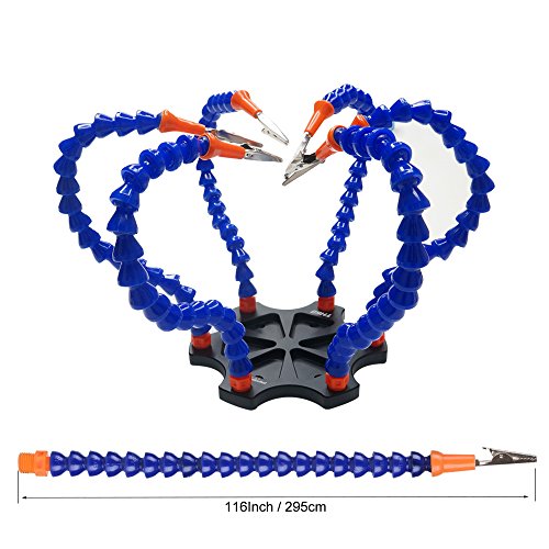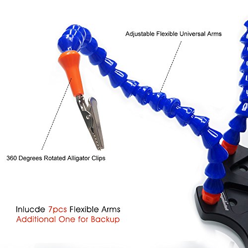 - [7 Flexible Helping Arms]: The additional one is for backup. Each arm has a large swiveling alligator clip, they can hold pieces firmly in place when soldering or working.