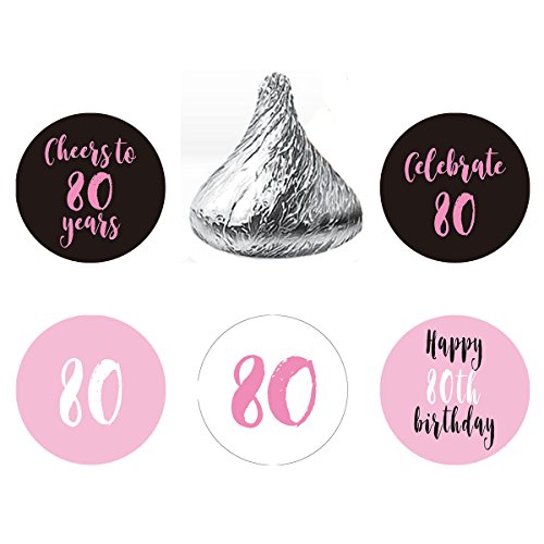 Pink 80th Birthday Party Favor Stickers, Round Candy Labels Fit Hershey’s Kisses, 200 Count