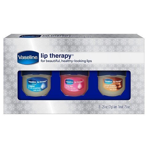 Surprise your special someone this year with a Vaseline Lip Therapy gift set! This gift set provides a perfect mix of products for discovering the Healing Power of Vaseline Lip Therapy. This exciting 3-item set features the following items: Vaseline Lip Therapy Original 0.25 oz, Vaseline Lip Therapy Rosy Lips 0.25 oz, and Vaseline Lip Therapy Cocoa Butter 0.25 oz. ||Includes: Lip Balm ||Health Concern: Chapped Lips ||Used For: Moisturizing ||Product Form: Balm ||Health Facts: Lightly Scented ||Scent: Cocoa Butter ||Flavor: Unflavored ||Travel Size: No ||Assembly Details: no assembly required ||Package Quantity: 1 ||Features: Moisturizes ||Capacity: Total Volume: .750 ||Product Warning: no warning applicable ||Made in the USA