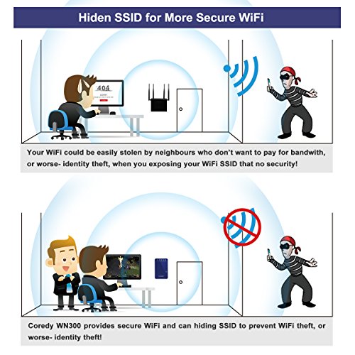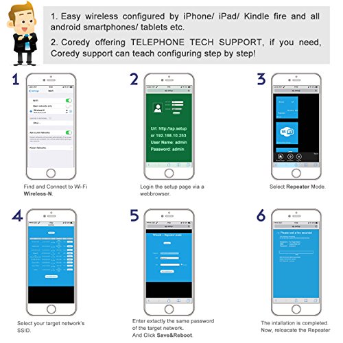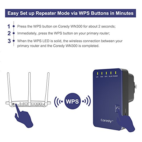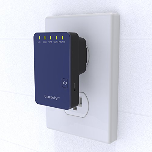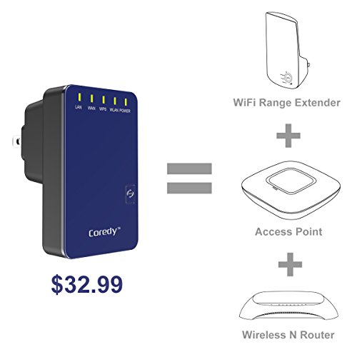 Coredy WN300- designed for eliminating Wi-Fi dead zones! Compact design with high performance; set up is very easy and friendly; a super cost-effective device you can not miss! (A $32.99 Coredy WN300 = WiFi Range Extender+ Access Point+ Wireless N Router) Multiple Functions: WiFi Range Extender (Repeater)- Extend WiFi coverage and improve the signal strength of existing wireless network. Wireless Access Point- Covert a wired network to a wireless network. Wireless N Router- Create an instant private wireless N network. WISP- Provides simultaneous wireless ISP access and shares an Internet connection wirelessly or via cables. High Performance and fast speed, no Wi-Fi dead zones any more! Adopt the Realtek chip solution for extra stability, 2 x internal antennas for strong WiFi signal and wide coverage. Say goodbye to Wi-Fi dead zones, wireless N speed up to 300Mbps throughout your home/office/ hotel room ect! Hidden SSID for More Secure WiFi Hiding the broadcast WiFi SSID to make the SSID unsearchable and preventing WiFi theft- or worse, identity theft! Security Type : WEP, WPA PSK, WPA2 PSK, WPA /WPA2 PSK (Mixed); WPA / WPA2 Encryption: TKIP, AES Easy Set up in Minutes 1. Support WPS function, allows you set it up in minutes by simply press WPS button of Coredy WN300 and your target router. 2. Can be wireless configured by iPhone/ iPad/ Kindle fire and all android smartphones/ tablets, or wired configured by laptops/ desktop computer. 3. Comes with a Quick Installation Guide for Repeater mode and a detailed User Manual for all modes, easily and quickly configuring even for a beginner! 4. Coredy offering TELEPHONE TECH SUPPORT, if you need, Coredy support can teach configuring step by step! Warm Tip: Please timely download the latest firmware for upgrading.Feature