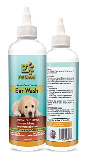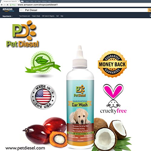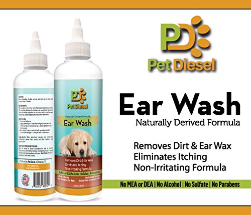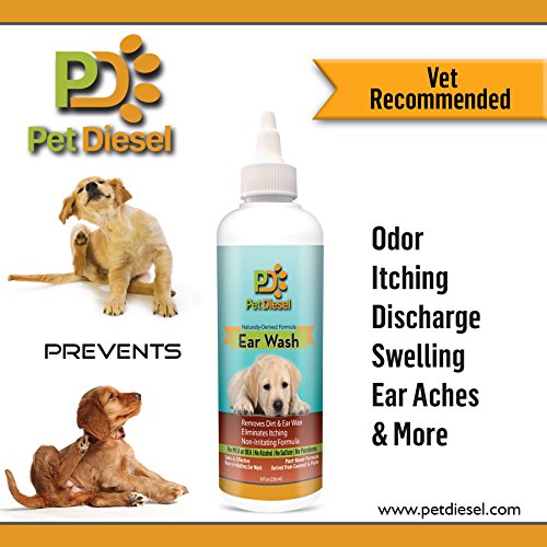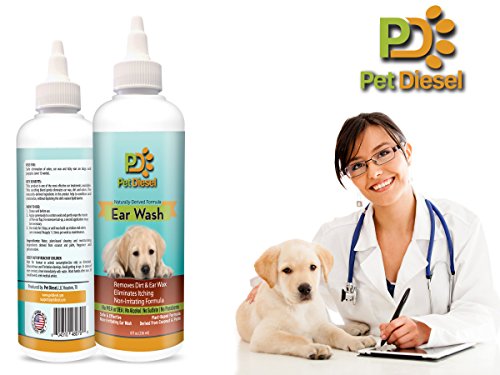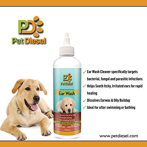 ♝ REMOVES DISCHARGE, SMELL, ITCHINESS, FUNGUS, WAX AND MORE!: Pet Diesel non-irritating ear cleaning wash can be used to treat various ear dog cases and problems. It will effectively eliminate odors and remove accumulated ear wax. No more itchy red ears and head shaking for your beloved friend since this ear cleanser will alleviate ear itching for dogs and puppies (over 12 weeks). This ear wash will clean, dry, acidify and deodorize the ear canal and allow your dog to be perky again!
