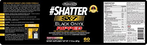 -. Feature : Pre-Workout/Weight Loss Hybrid Formula / Myristica, Satsuma Orange, Scutellaria & Black Currant &Ndash; A Blend Of Premium Ingredients That Contributes To The Extreme Sensory Experience. / L-Citrulline &Ndash; An Amino Acid That Is Metabolized Into Arginine And Nitric Oxide. / Beta-Alanine &Ndash; A Popular Pre-Workout Ingredient That Has Been Added In A Precise Dose For A Truly Complete Formula. / #Shattertm Sx-7® Black Onyxtm Ripped Is The New Dual-Function Pre-Workout/Weight Loss Hybrid Formula From Muscletech®. This Unique Formula Combines Precise Doses Of Powerful Pre-Workout Ingredients, Such As Beta-Alanine, Taurine And Citrulline, Plus A Scientifically Tested Key Weight Loss Driver Backed By Two Human Studies. #Shattertm Sx-7® Black Onyxtm Ripped Also Features A One-Of-A-Kind Mix Of Sensory Ingredients Including Myristica Fragrans, Satsuma Orange, Scutellaria And Black Currant Powd