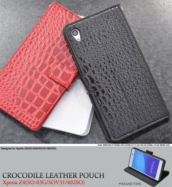 Xperia Z4(SO-03G/SOV31/402SO)用クロコダイルレザーデザインスタンドケースポーチ