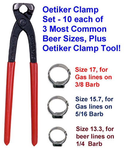 Studio : Kegconnection Publisher : Kegconnection Product Description This set includes a metal Clamp Tool and 10 each of the most popular sizes of Oetiker clamps used in the beer industry, including: 13.3 Clamps for attaching standard 3/16 ID X 7/16 OD Beer line to the most commanly used 1/4" barb. 15.7 Clamps for attaching Standard 5/16 ID X 9/16 OD Gas line to the commanly used 5/16 barb. 17 Clamps for attaching Standard 5/16 ID X 9/16 OD Gas line to the commanly used 3/8 barb. 0