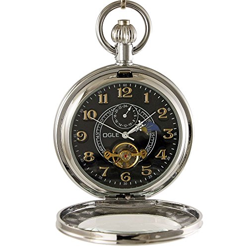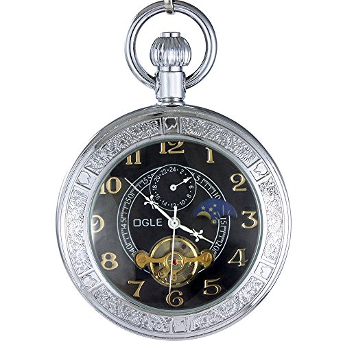 -. Title : OGLE Waterproof Magnifier Tourbillon Phases Moon Chain Fob Automatic Mechanical Black Pocket Watch