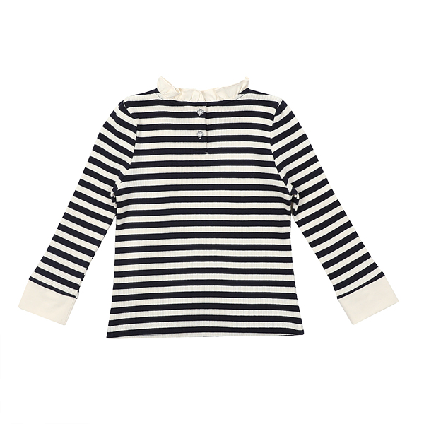 상품설명 네이비 스트라이프 프릴 티셔츠입니다. 잔잔한 골지바닥에 네크 프릴, 손목 넓게 배색된 립으로 재미를 주었구요. 캣 플라워 스팽글 자수 모티브가 고급스럽게 포인트되어줍니다.