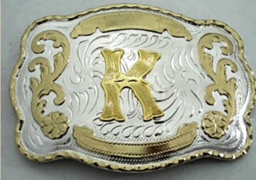Product DescriptionInitial Letter " K " Name Monogram Western Cowboy Gold and Silver Tone Belt Buckle0