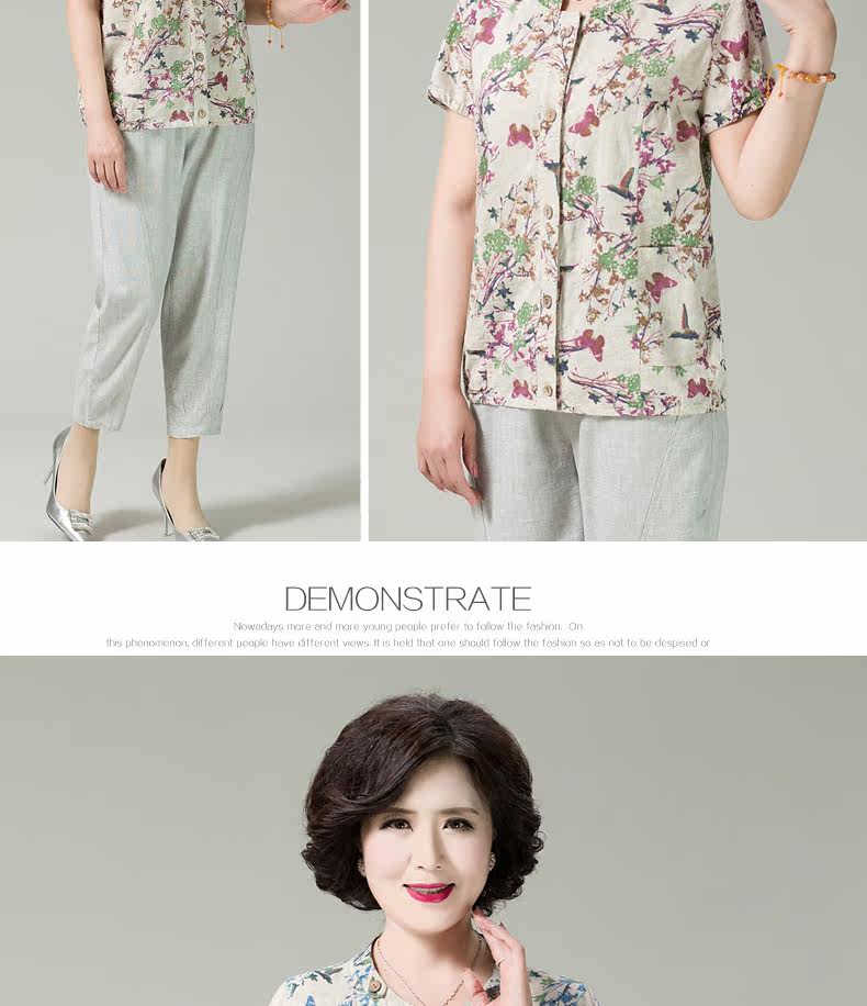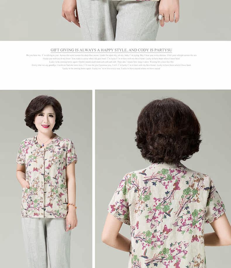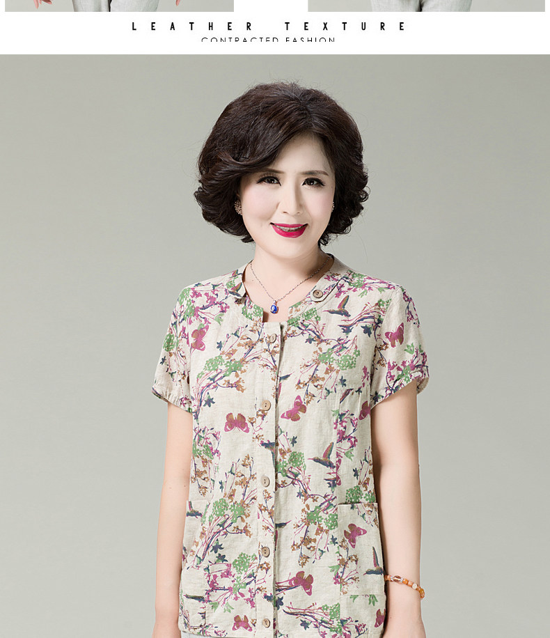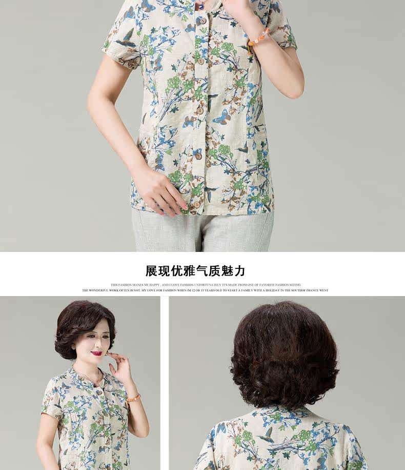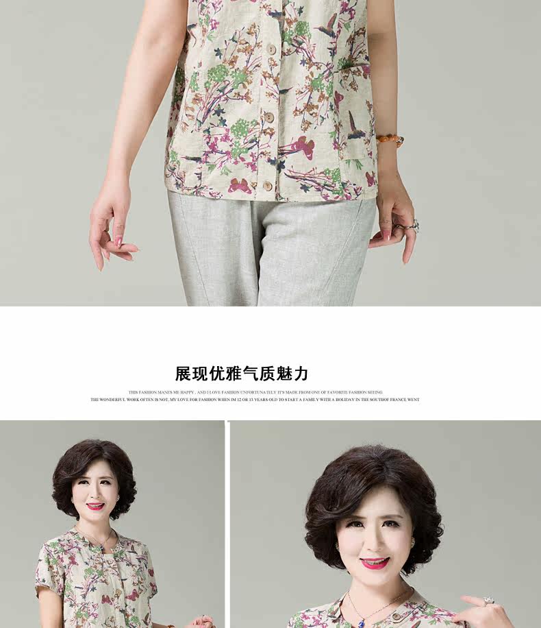 中老年女装夏装新款棉麻短袖T恤女宽松中年妈妈居家开衫短袖衬衫
