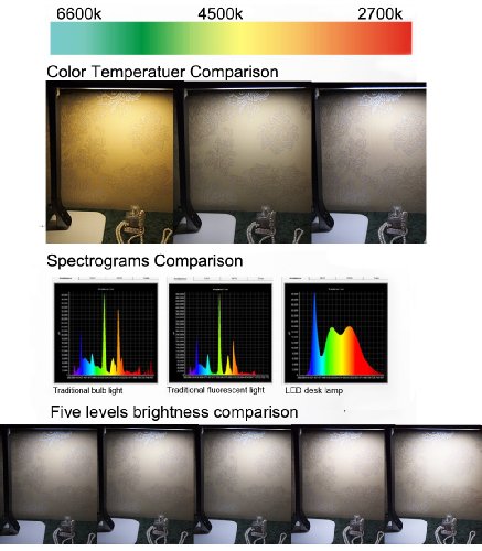 - Feature : Provides Eco-friendly, Natural, Non-flickering Light for stress free productivity and enjoyment. / 3 Light Spectrum Modes: Cold Light Environment (for Studying), Natural Light Environment (for Reading), and Warm Light Environment (for Bedtime / Relaxation) to suit any need. / 5 Step Brightness Control in each mode, allowing adjustment for best comfort and use. / Built-in Touch Pad and Dimming control system for your easy and simple operation. / Flexible positioning possible for use in office, bedroom, school, and reading.