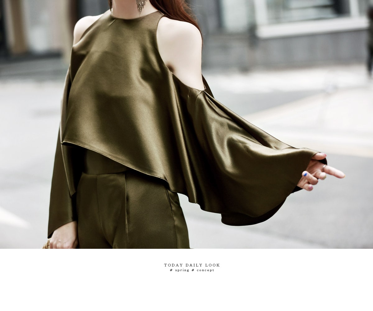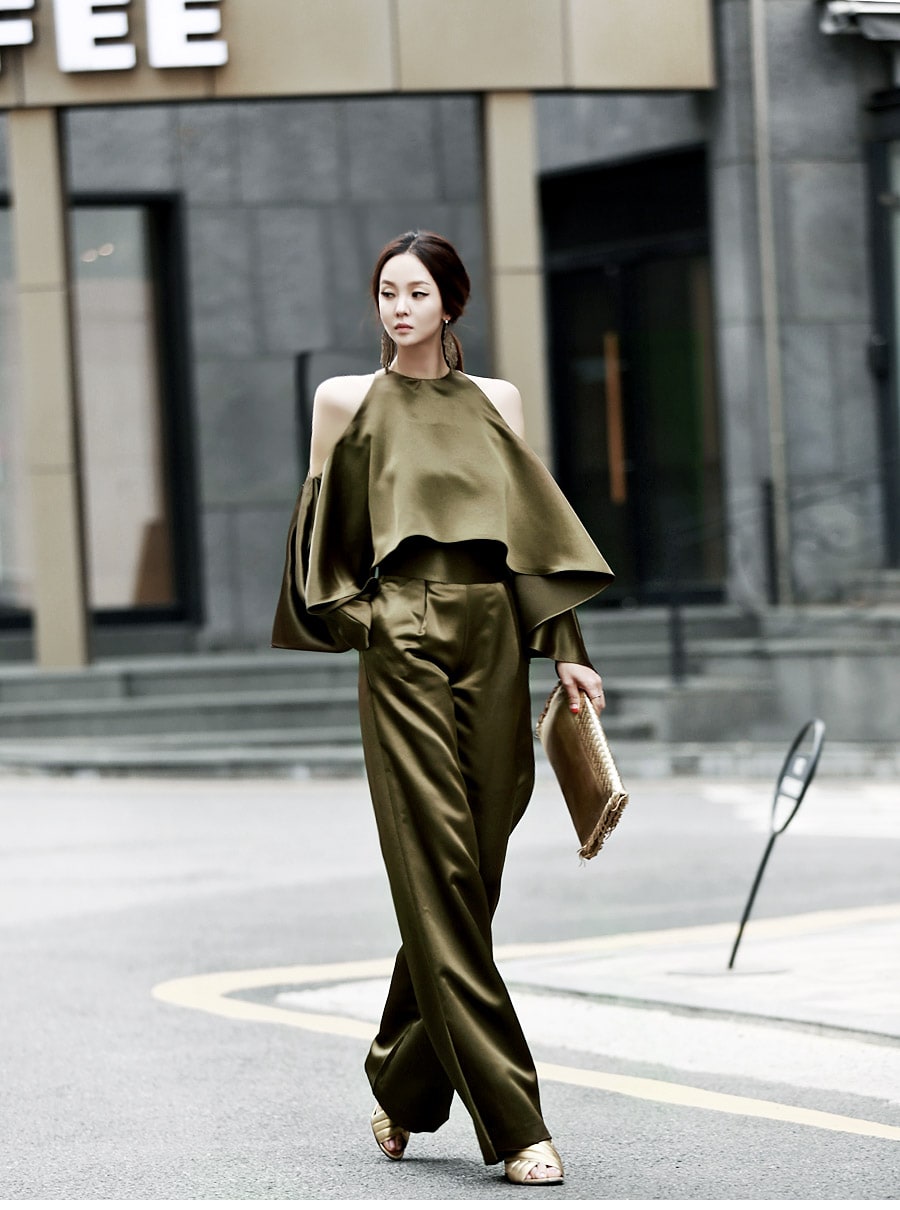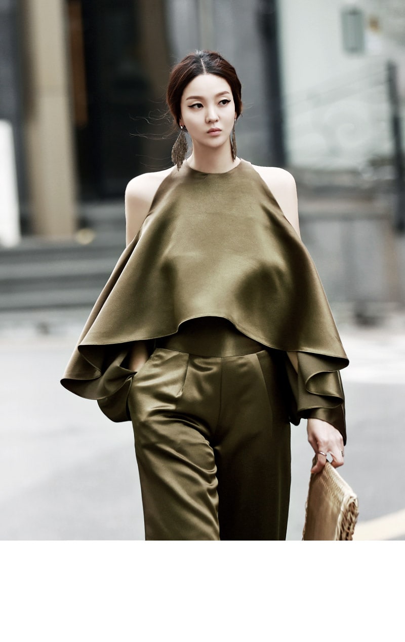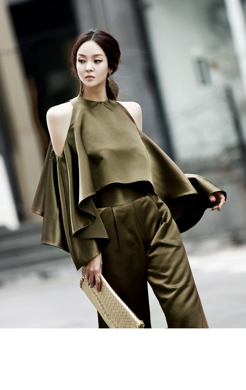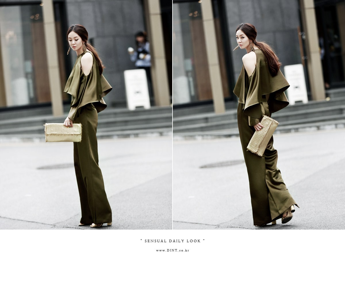 B1992 클로티 오프숄더 훌 블라우스 KhakiP1684 클로티 샤틴 와이드 슬랙스 KhakiAJ-3438 이어링 Gold HAR-501 럭셔리 엠보 스트랩 뮬*HAND MADE* Gold