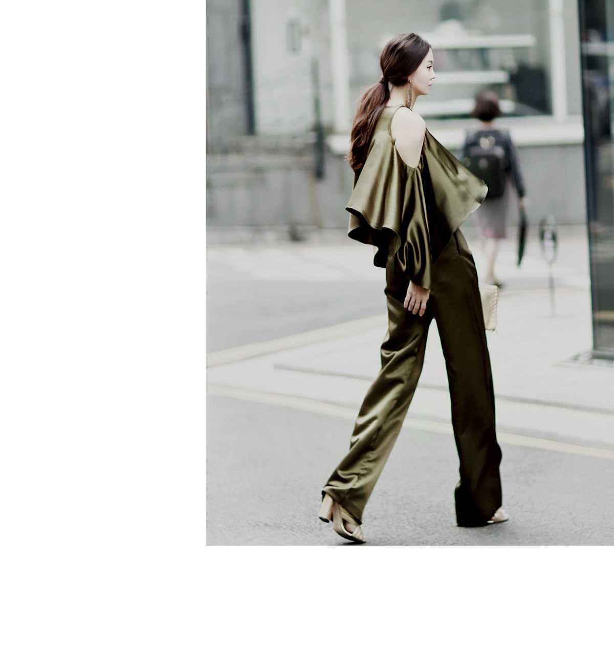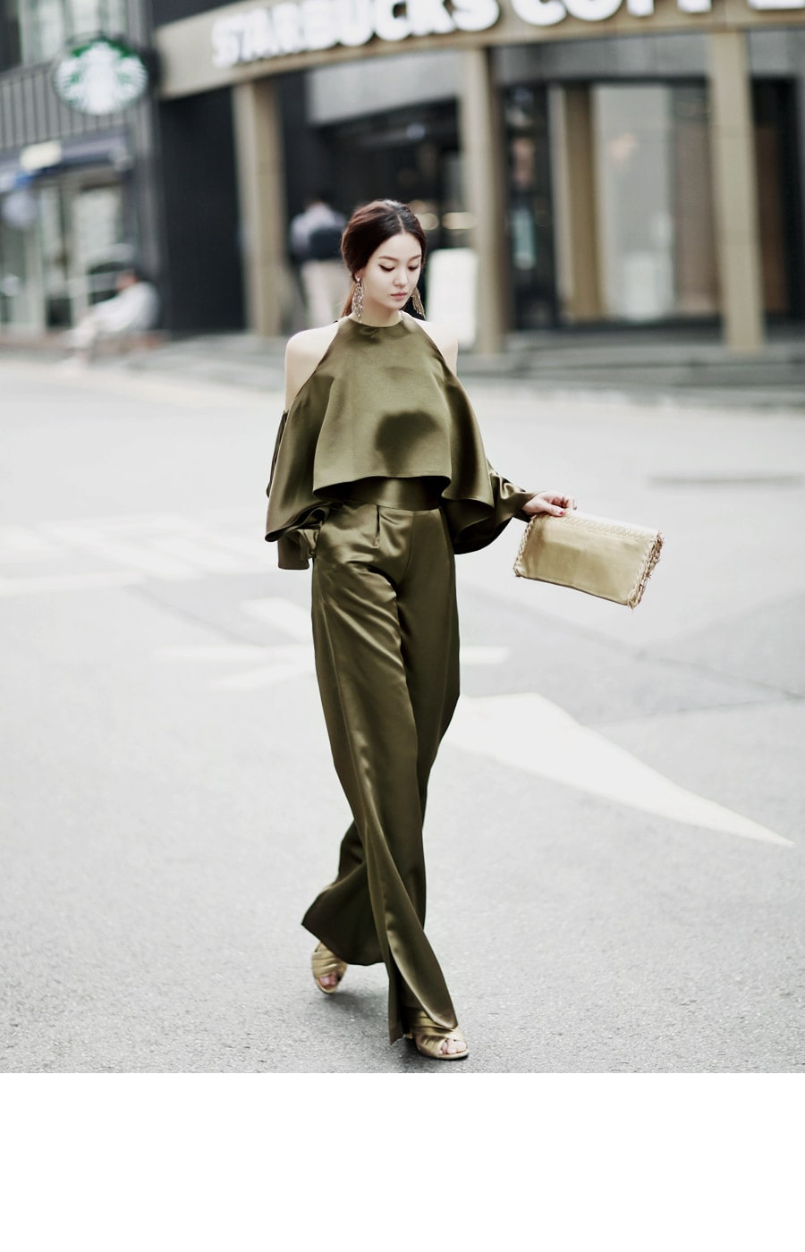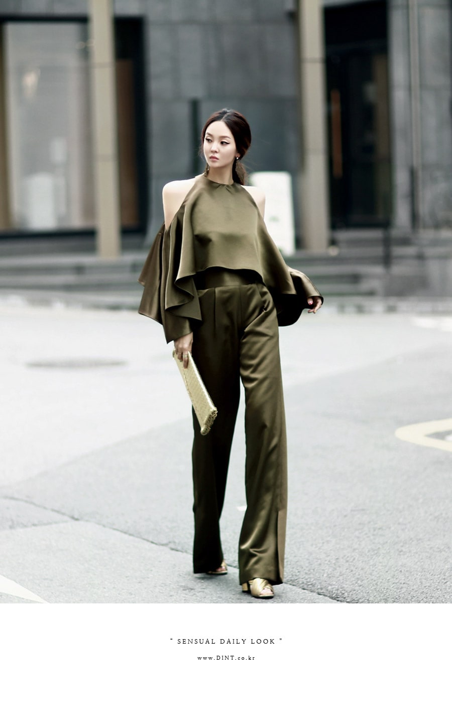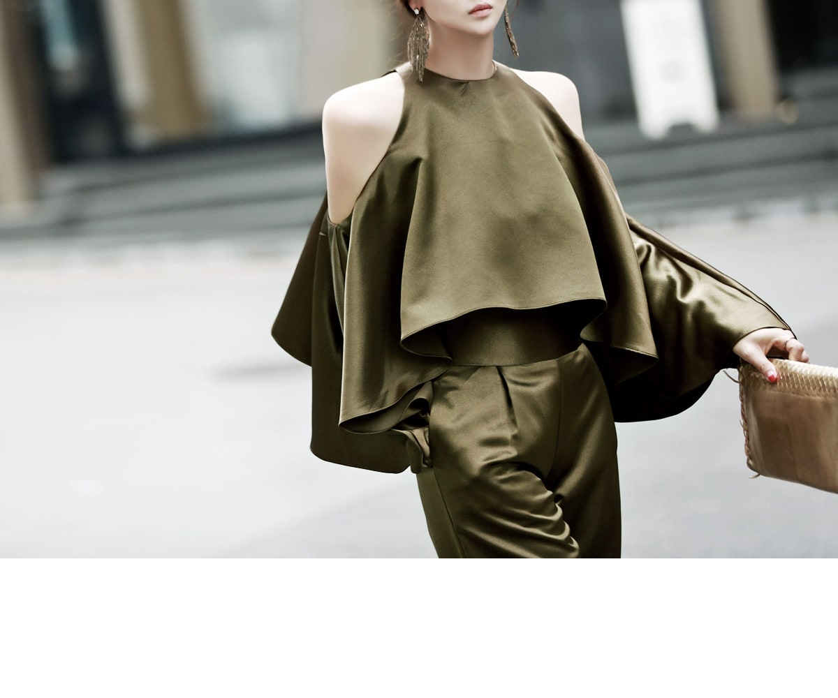 B1992 클로티 오프숄더 훌 블라우스 KhakiP1684 클로티 샤틴 와이드 슬랙스 KhakiAJ-3438 이어링 Gold HAR-501 럭셔리 엠보 스트랩 뮬*HAND MADE* Gold