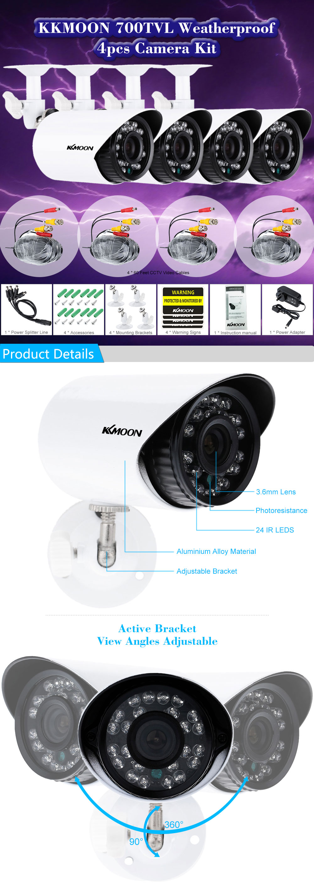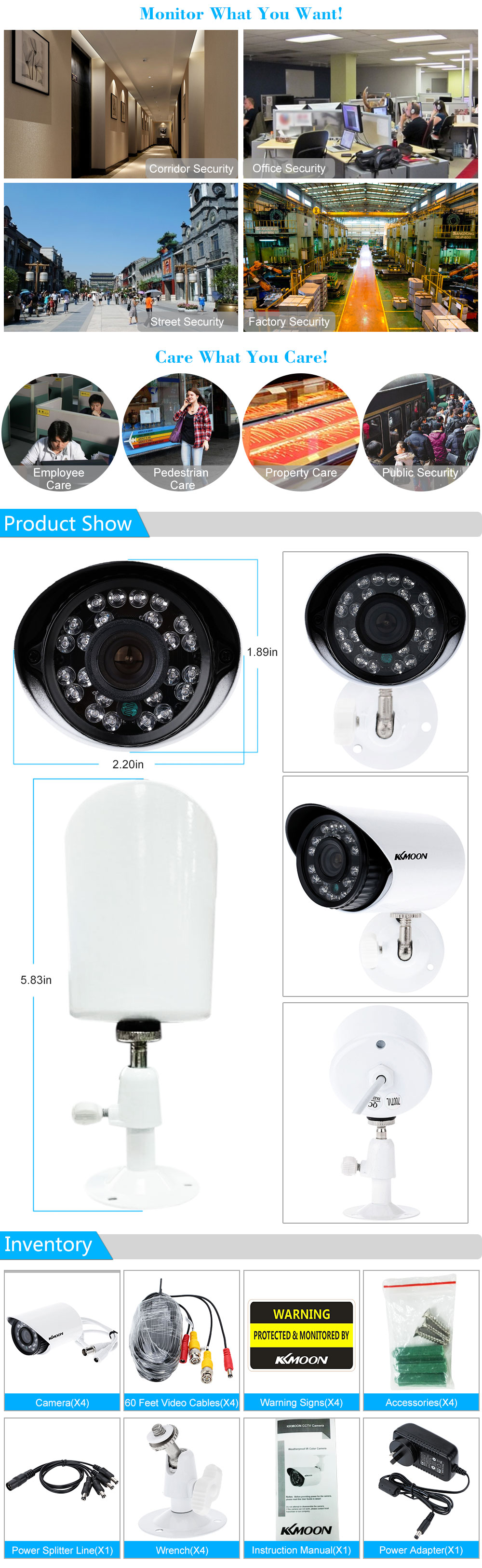 This CCTV Camera Kit includes 4pcs color CMOS night vision security cameras, 4pcs 60 feet video power cables for cameras, which form a full rage of monitoring to meet your need.