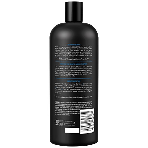 -. Binding : Health and Beauty -. Brand : TRESemme -. EAN : 0022400393681 -. Feature : Tresemme smooth and silky shampoo has an advanced smoothing system that delivers intense moisturization where your hair needs it most / Tresemme smooth and silky shampoo is light enough for daily use keeping your hair moisturized and touchable soft / This tresemme smoothing shampoo calms frizz and flyaway without weighing hair down / This tresemme shampoo works to cleanse and help tame unruly hair, leaving it smooth and salon-soft / Tresemme smooth and silky shampoo works great by itself, or alongside our other tresemme smooth and silky products -. Label : AmazonUs/UNLFA -. Manufacturer : AmazonUs/UNLFA -. Model : 10022400393688 -. NumberOfItems : 1 -. PackageQuantity : 1 -. ProductGroup : Pantry -. ProductTypeName : BEAUTY -. Publisher : AmazonUs/UNLFA -. ReleaseDate : 2015-03-19 -. Studio : AmazonUs/UNLFA -. Title : TRESemmé Smooth and Silky Shampoo, Moroccan Argan Oil 28 oz -. UPC : 022400393681