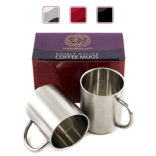 -. Brand : Farnsworth & Lloyd -. Feature : Coffee Mug Set contains two 12 ounce coffee mugs/tea cups in a handsome gift box. / The insulated mugs Durable double wall stainless steel construction keeps contents warm without burning your hands. / This Coffee Cup Set's Condensation Free Design protects table tops and other surfaces. / All stainless construction is BPA free and durable enough for use at the office, in the home, or while out camping. / Drop Safe - Coffee Cups Won't break if knocked off a counter. -. Label : Farnsworth & Lloyd -. Manufacturer : Farnsworth & Lloyd -. PackageQuantity : 2 -. ProductGroup : Kitchen -. ProductTypeName : KITCHEN -. Publisher : Farnsworth & Lloyd -. Size : 12 oz -. Studio : Farnsworth & Lloyd -. Title : Stainless Steel Double Wall Coffee Cups/Coffee Mugs, Set of 2