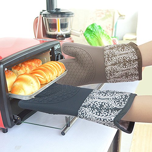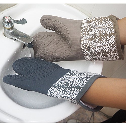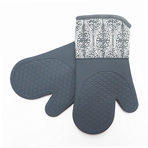 Heat Resistant Silicone Oven Mitts With Quilted Cotton Lining, 1 Pair Non - Slip Extra long Kitchen Glove for BBQ, Cooking, Baking, Grilling, Barbecue, Mimicrowave, Machine Washable (Gray)