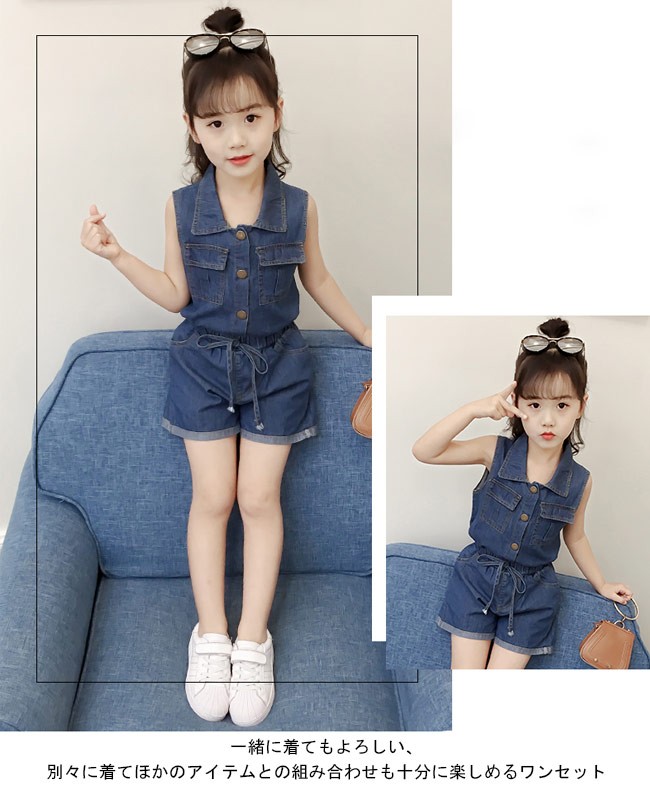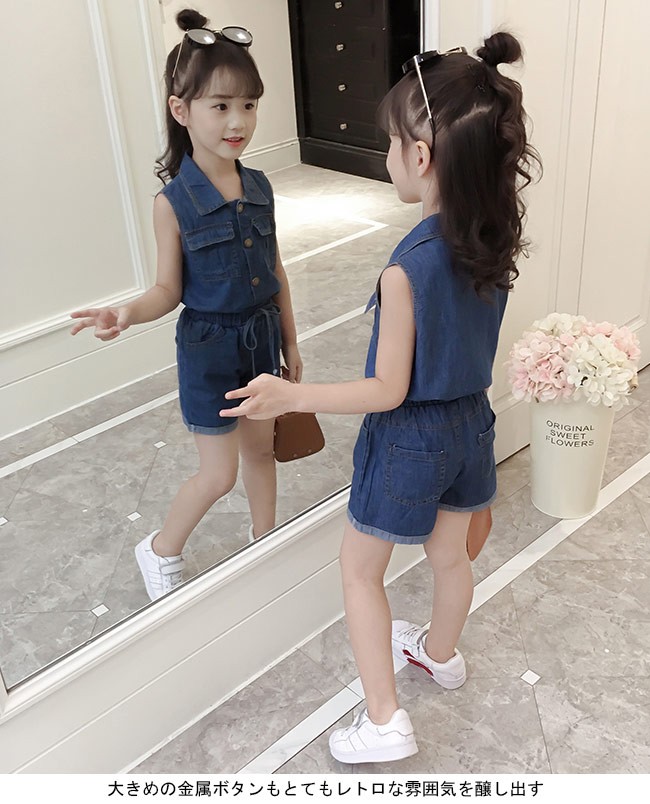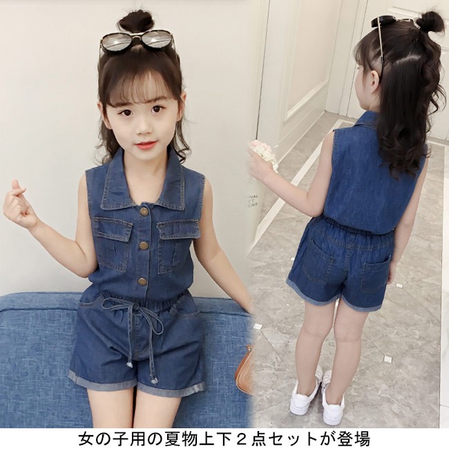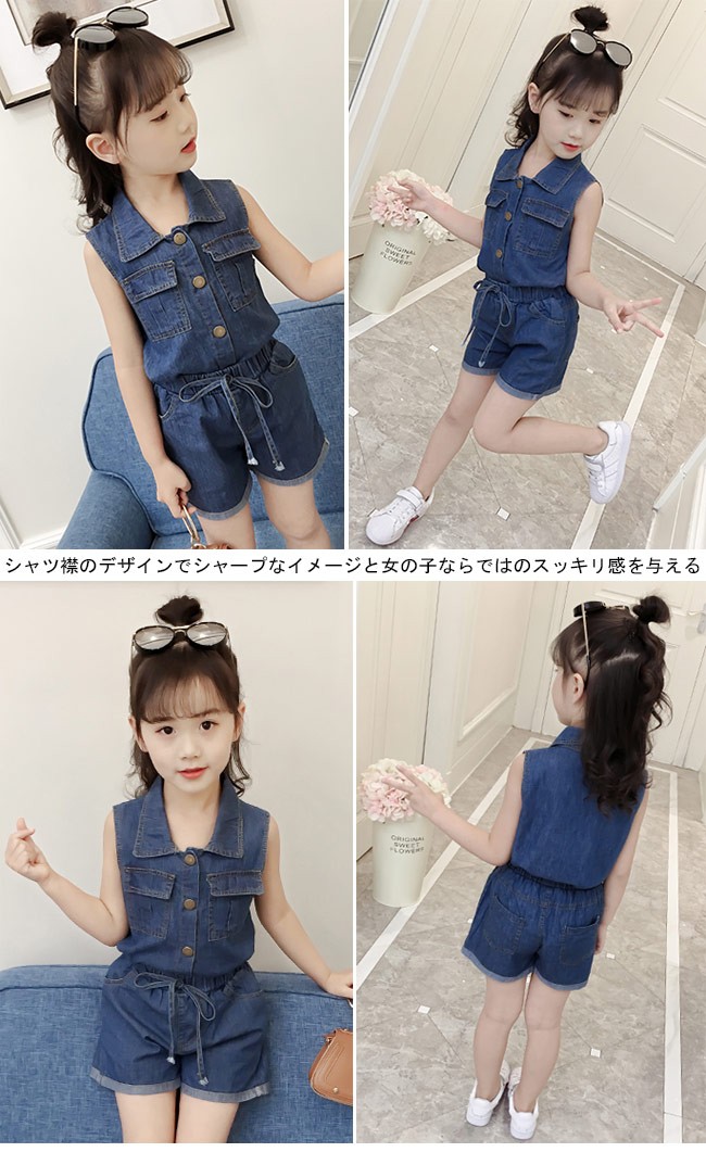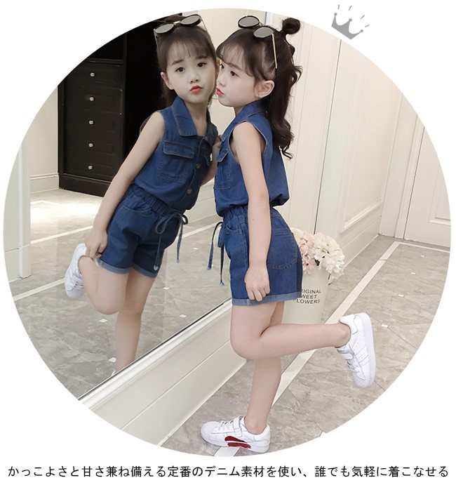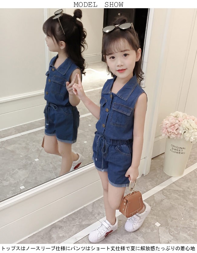 子供服 2点セット デニム 女児 ノースリーブシャツ ショートパンツ ウエストゴム 夏物 セットアップ 女の子 ジーンズ ジーパン キッズ女の子用の夏物上下2点セットが登場トップスはノースリーブ仕様にパンツはショート丈仕様で夏に解放感たっぷりの着心地シャツ襟のデザインでシャープなイメージと女の子ならではのスッキリ感を与える大きめの金属ボタンもとてもレトロな雰囲気を醸し出すかっこよさと甘さ兼ね備える定番のデニム素材を使い、誰でも気軽に着こなせるカラー:写真色素材 綿混紡サイズ(cm) 110 120 130 140 150 160110 トップス 着丈40 バスト66 パンツ 総丈25120 トップス 着丈43 バスト70 パンツ 総丈27130 トップス 着丈46 バスト74 パンツ 総丈29140 トップス 着丈49 バスト78 パンツ 総丈31150 トップス 着丈52 バスト82 パンツ 総丈33160 トップス 着丈54 バスト86 パンツ 総丈35ご注意:※サイズは平置きサイズです。素人採寸ですので、若干の誤差がございます、ご了承ください。