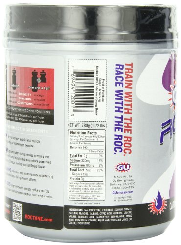 ReleaseDate : 2013-07-16 Studio : GU Energy Labs Publisher : GU Energy Labs Binding : Health and Beauty Product Description Roctane Ultra Endurance Energy Drink is a carbohydrate intensive energy drink for ultra-distance and intense efforts. It contains the critical carbs and electrolyte replenishment that endurance athletes need to compete at high levels. It is a super light tasting, easy to mix formula for fueling serious efforts. Each serving contains 240 calories of complex and simple carbs that is optimized for rapid absorption and energy accessibility. Key electrolytes help with hydration. Roctane Ultra Endurance Drink contains beta-alanine which supplements dietary beta-alanine to improve muscle buffering during intense efforts and branch chain amino acids, shown to serve as an additional fuel source (when taken with carbohydrates), reduce muscle damage, enhance recovery and delay fatigue. Roctane Drink mixes easily and isn't chalky like most calorie dense drinks on the market. The key ingredients in the drink are specifically designed for long and intense endeavors. For many athletes, all they may need during prolonged exercise is one 21oz bottle of Roctane Drink and 1 Roctane Gel per hour for 340 calories and extra nutritional support to maximize performance. 0