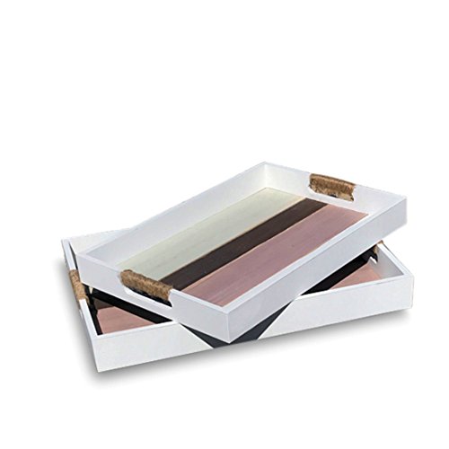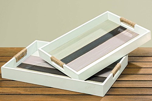 - Crafted of MDF Wood, these trays have solid perimeters and are inset with panels that resemble shiplap siding. Contrasting sides of white with natural twine wrapped handles add a coastal touch and bring on summertime vibes no matter what time of the year it is.