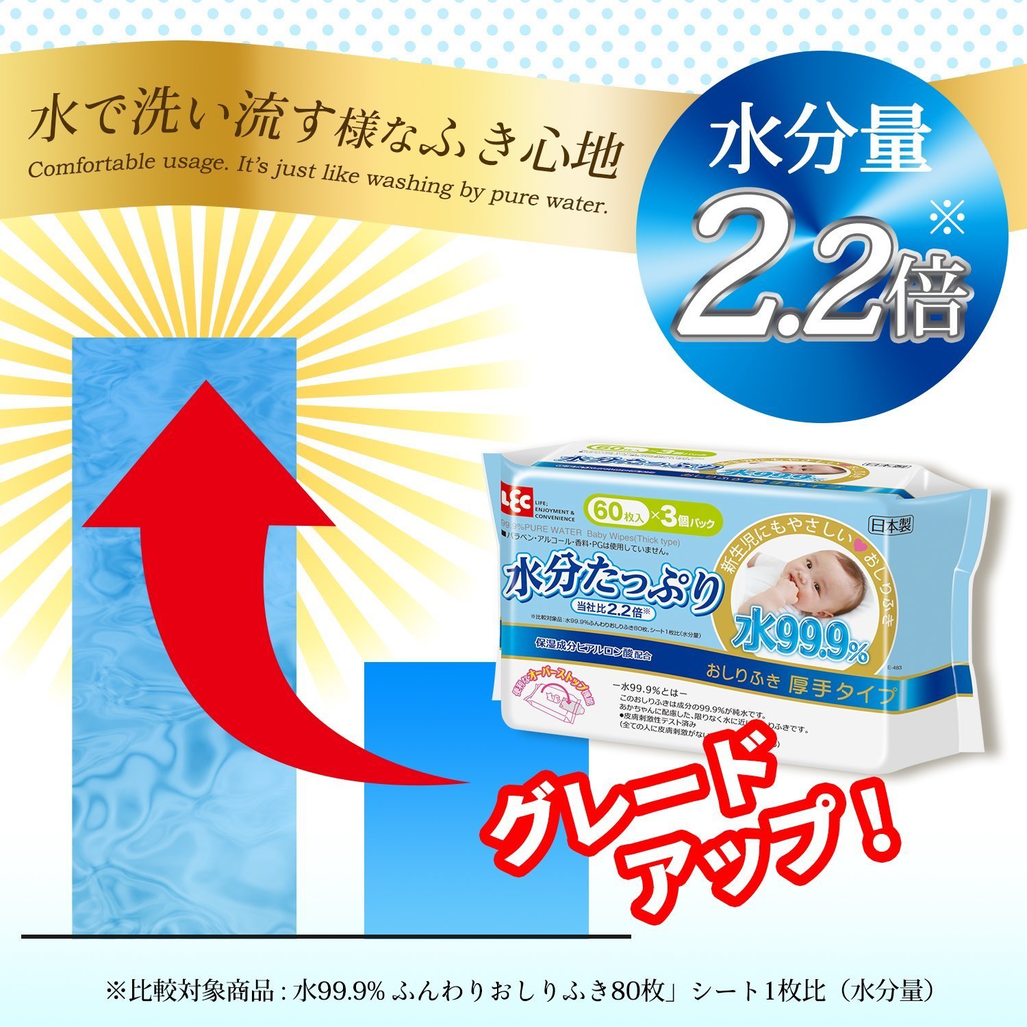 ● 99.9% made from pure water, safe assortment of ingredients close to water as far as possible.