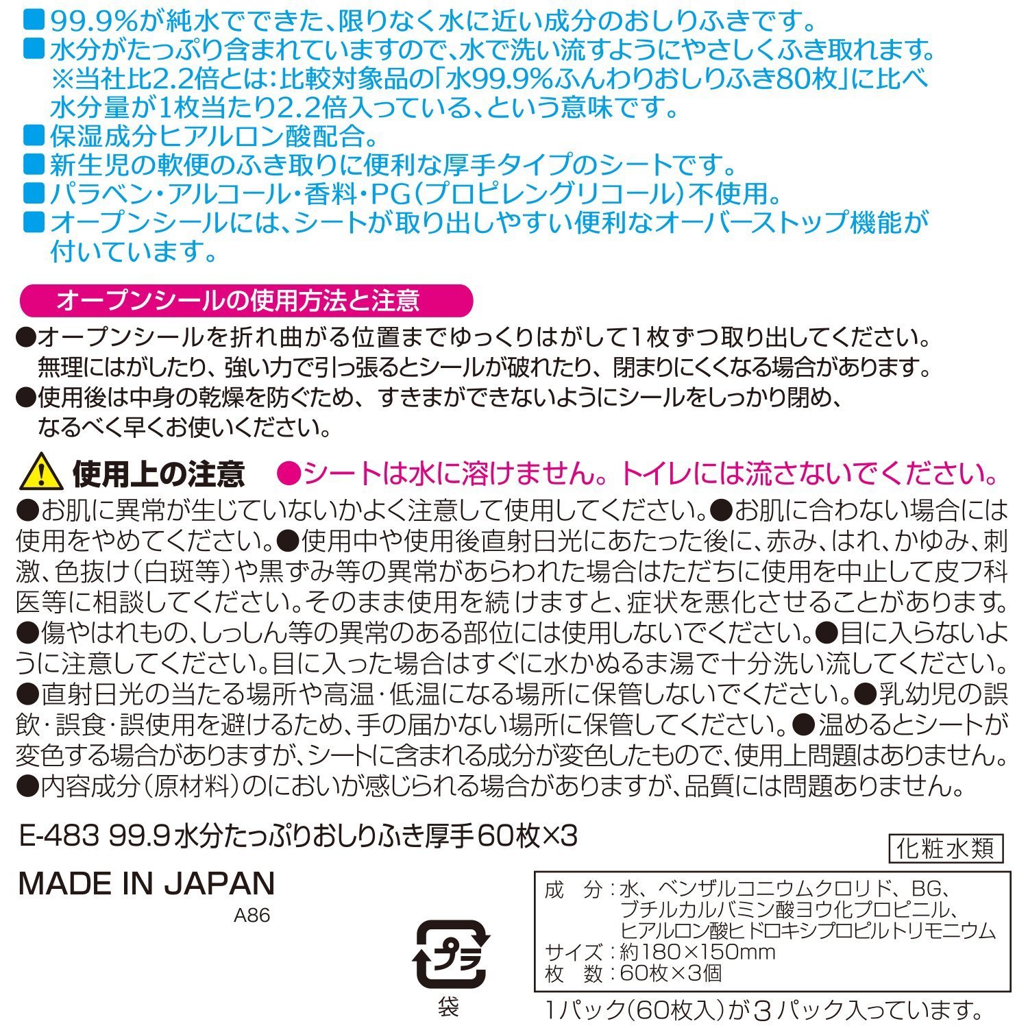 ● Because it is easy to wipe with plenty of moisture and a thick sheet, it will not wipe many times, reducing the burden of delicate skin.