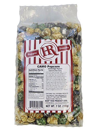 -. Binding : Misc. -. Brand : HR Poppin' Snacks -. EAN : 0813932007012 -. Feature : 7 oz package with 7.5 servings / 6 month shelf life / Processed in a facility that also processes peanuts and tree nuts / Contains: Milk and soy / For the military or "outdoor" sports person who has everything -. IsAdultProduct : 0 -. Label : HR Poppin' Snacks -. Manufacturer : HR Poppin' Snacks -. PackageQuantity : 1 -. ProductGroup : Grocery -. ProductTypeName : GROCERY -. Publisher : HR Poppin' Snacks -. Studio : HR Poppin' Snacks -. Title : HR Poppin' Snacks Camo Popcorn - Made in USA - Made in Nebraska - 100's of flavors to choose from - Delicious, fresh popcorn - Gourmet, sugar free, and wine flavors - Nebraska popcorn - Produced in Gibbon, Nebraska -. UPC : 813932007012