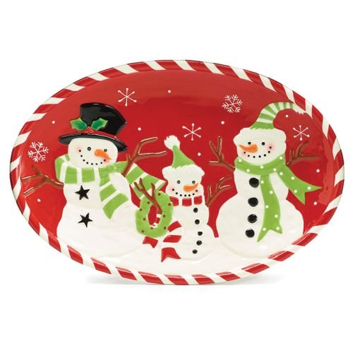 - Red hand painted ceramic oval platter with three slightly raised snowmen and snowflake design