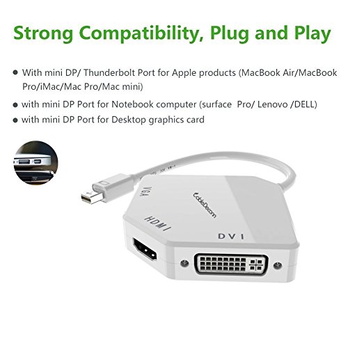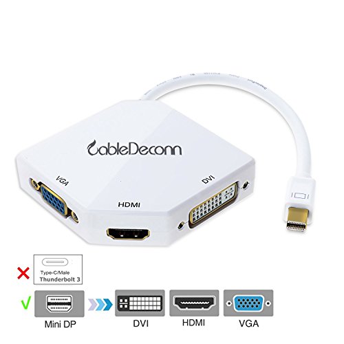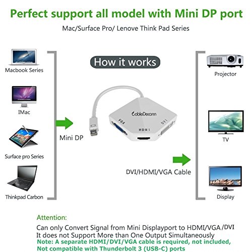3-IN-1 Mini DisplayPort Male to HDMI/DVI/VGA Adapter Cable converter,Note: Only supports 1 display output at a time A separate HDMI/DVI/VGA cable is required, not included, Not compatible with Thunderbolt 3 (USB-C) ports