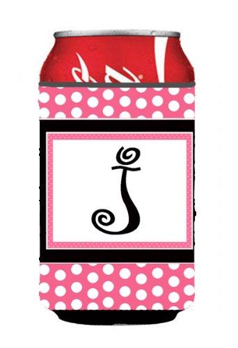 Letter J Initial Monogram - Pink Black Polka Dots Can or Bottle Beverage Insulator Hugger
