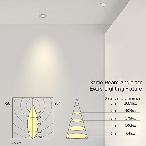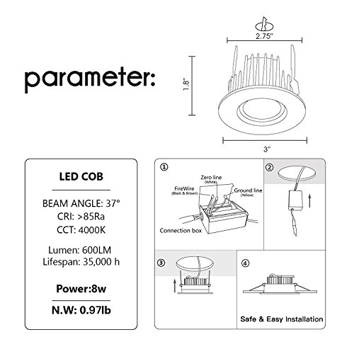 - Beam Angle: 37° (condenser), Cutout: 2.75 inches, Anti-glare warm white light 3000K, Powdered white of refined finishes great for any decor.