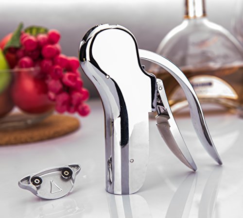 - 3. THE PROCESS OF USING: Please read the instruction manual carefully before using it. Corkscrew has a lever that you push down that drives the corkscrew into the cork, and then you pull up to remove the cork. Another down and up of the lever and the cork pops off the corkscrew. Beginning to end, the process takes three seconds. The corkscrew is in a stunning silver color with a chrome plated lever.