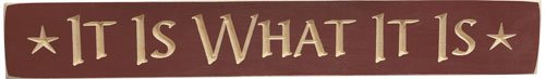 - Painted, distressed wooden plaque, engraved with "It Is What It Is" in cheerful script, accented with stars. Carved notches in back make it easy to hang. 24" long and 3-1/2" wide, 3/4" thick.