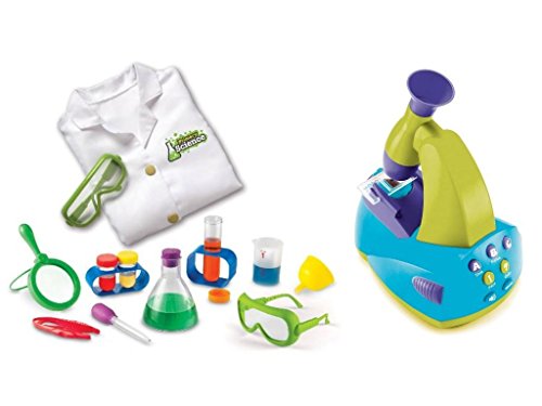 -. Binding : Toy -. Brand : MegaMarketing -. EAN : 4913963147094 -. Feature : Age Range: 3 years and up; This toy is not suitable for ages under 3 years. It contains one or more of the following items: marbles, small ball, or small parts. / 14-Piece Science Kit for Kids / Glasses are adjustable and coat is easy to take on/off with 2 oversized snaps; Fits most children ages 3-6 / Includes Talking Microscope with 5x focusing magnifier and light for easy viewing and 12 slides. / Encourages scientific exploration and discovery, and introduces a key scientific tool in a fun way!; Requires 3 C batteries (not included). -. IsAdultProduct : 0 -. Label : MegaMarketing -. Manufacturer : MegaMarketing -. ProductGroup : Toy -. ProductTypeName : TOYS_AND_GAMES -. Publisher : MegaMarketing -. Studio : MegaMarketing -. Title : Learning Resources 14-Piece Primary Science Kits for Kids with Young Scientist's Lab Coat and Lab Glasses, and Educational Insights GeoSafari Jr. Talking Microscope Set with Slides Bundle