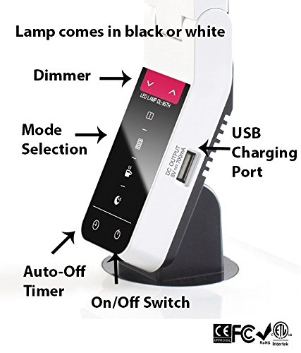Softech - Natural Light Smart LED Lamp with Tilting Head -Black (4 Lighting Modes, 5-Level Dimmer, Touch-Sensitive Control Panel, 1-Hour Auto Timer, USB Charging Port, Mobile Device Charger)
