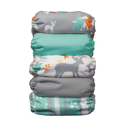 • Woodland Collection Package includes 5 Newborn All In One Diapers: 3 prints and 2 solids