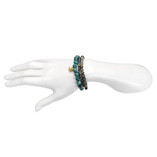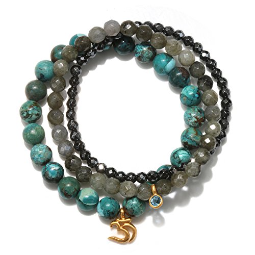 Round faceted 8mm Turquoise, 6mm Labradorite, and 4mm Hematite stones are paired with a 18kt gold plated 10mm Om charm and Blue Topaz stone.