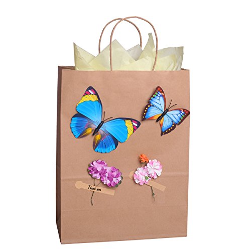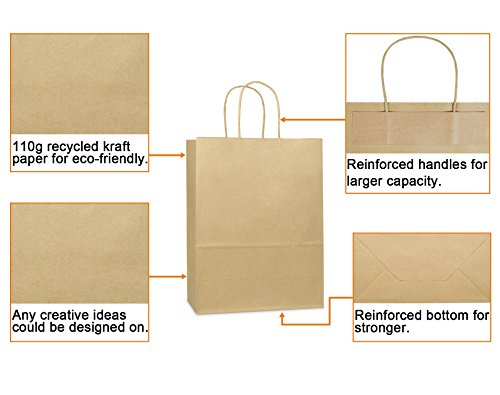 ?Our kraft shopping bags are glossy paper which make them a little more elegant looking than the plastic which tend to tear easily. ?The retail paper bags are perfect size and work beautifully for your business. At this price, they are nice to be able to place product in such a simple yet elegant handy bag for your customers. On the other hand, you could print your own labels/logo stamp and put them on each bag, made the shopping bags on behalf of your store. ?Besides, they are perfect for decorating. You could dress the brown bags up by using ribbon, markers, glitter and pompoms. It it a great way to let the children bring out their creative side that letting them sit color and draw on these bags. Different color will perfect for Easter, Christmas, Thanksgiving, baby shower, any patriotic holiday or birthday and etc. It is a really fun experience and created a lot of cute memories!