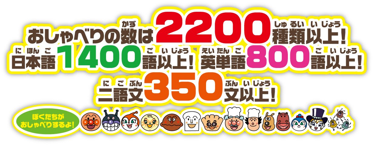 楽しく遊びながらことばが学べる!図鑑の絵をタッチするだけで、アンパンマンのキャラクターたちがことばを教えてくれるよ。ペンのスイッチを切り替えるだけで、アンパンマンたちの教えてくれる「ことば」がネイティブ発音の「英単語」になり、さらに二語文マークのあるページでは「二語文」もおしゃべりしてくれる。