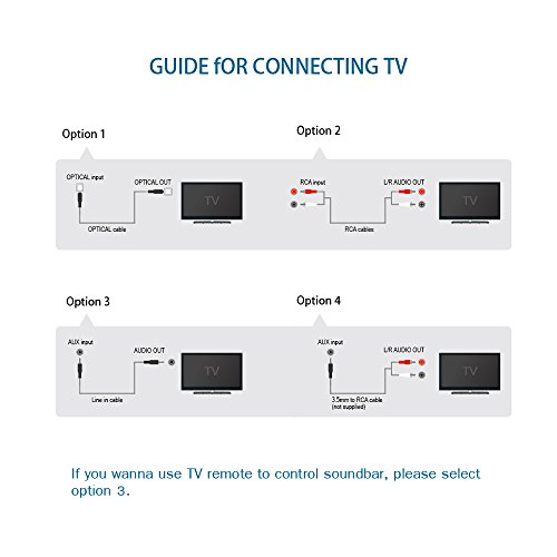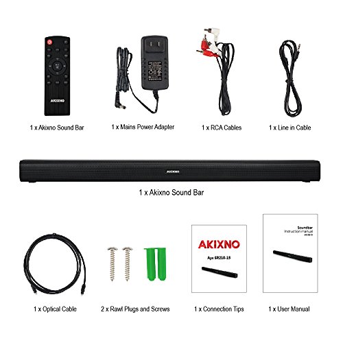 -. Feature : 33 Inches 2.0 Channel Bluetooth TV Sound Bar: The soundbar with 4x10W powerful speaker drivers streams much more spacious, immersive and crystal-clear sound. Unlike other soundbars, this one doesn't have Standby mode, so no need to worry the soundbar will automatically turn off, providing the best audio experience for all your entertainment. / Wired and Wireless Connections: The sound bar offers Bluetooth connectivity to stream content from smartphones, tablets and computers quickly and flawlessly from 26 feet away without obstacles. The line in/RCA/optical inputs make wired connections allowed with a line in cable, RCA cables, 3.5mm to RCA cables or optical cable to enhance better sound quality whenever. / Easy Setup & Operation: Control the soundbar via buttons on the side of soundbar or via a dedicated remote control to turn the power on/off, change the modes, adjust bass/volume etc. It can be placed flat on a cabinet or securely mounted on the wall with included hardware to upgrade your TV's tinny built-in sound, with minimal fuss and maximum ease. / Premium & Crafted Design: The ABS and steel construction appeal to more fashion-conscious, the robust build quality and colour schemes unite to make it a neat, uncluttered look in your room without taking up much more space. / What You Get: 1 x Akixno Sound Bar, 1 x Remote Control, 1 x Mains Power Adapter, 1 x RCA Cable, 1 x Optical Cable, 1 x Line in Cable, 2 x Rawl Plugs and Screws (for Wall Mounting), 1 x User Manual, 18-Month Warranty and 7 x 24hrs Customer Service.