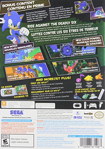 When the Deadly Six threaten to destroy his world, Sonic's new moves and power-ups are the only way to defeat them before it's too late! In his latest plot to defeat Sonic and rule the world, Dr. Egg man has harnessed the power of six menacing creatures known as the Deadly Six. However, when the Deadly Six rise up against their new master, Sonic must unite with his arch nemesis Dr. Egg man and explore the mystical Lost Hex in order to take them on head-to-head. Use Sonic's amazing new moves and incredible Color Powers to speed across a variety of unique terrains, racing inside, outside and upside down in every level.