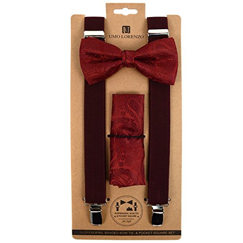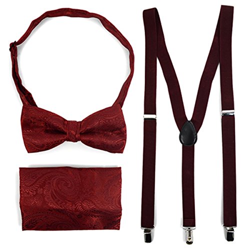(TheDapperTie)/Accessories/Ties/DIRECT FROM USA/3pc Men's Burgundy Paisley Banded Suspenders, Paisley Bow Tie and Hanky Sets
