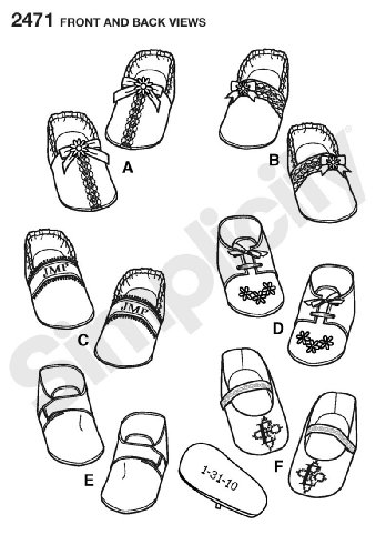 -. Feature : Baby shoes in size os (one size), simplicity pattern 2471 / Number of looks included:6 / Designed and manufactured in the USA
