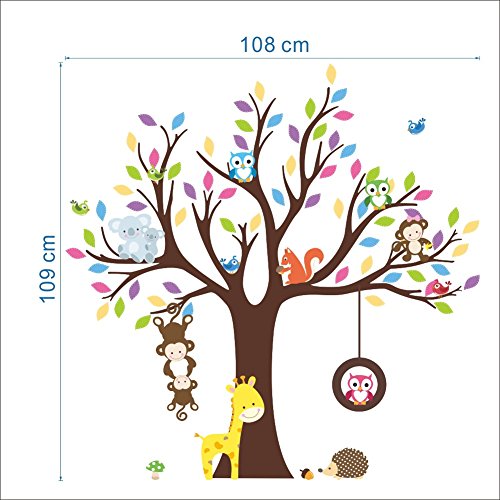 Amaonm Creative Fashion Cartoon Zoo Animals and Giant Colorful Brown Tree Wall Stickers Murals Owls Wall Decal Monkey, Giraffe, koala Wall Decor for Bedroom Nursery room Baby Children Room